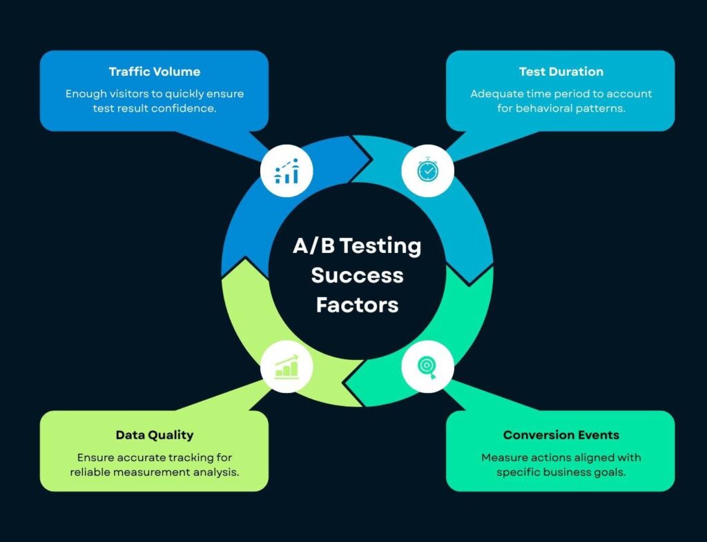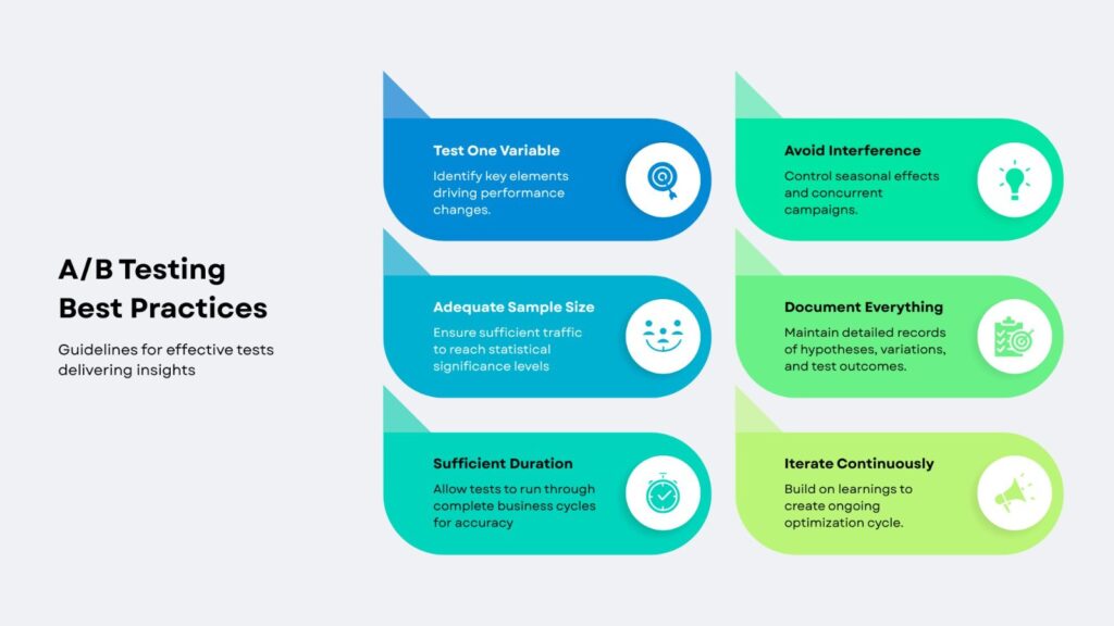 Running effective A/B tests also requires attention to statistical significance and test duration. Ending a test too early or with too little traffic can lead to misleading conclusions, where random fluctuations appear as real improvements. Best-practice guides recommend predefining goals, minimum sample sizes, and timeframes, then letting tests run long enough to account for weekday/weekend behavior and traffic variation. This discipline helps avoid “false wins” that fail to hold up in production.