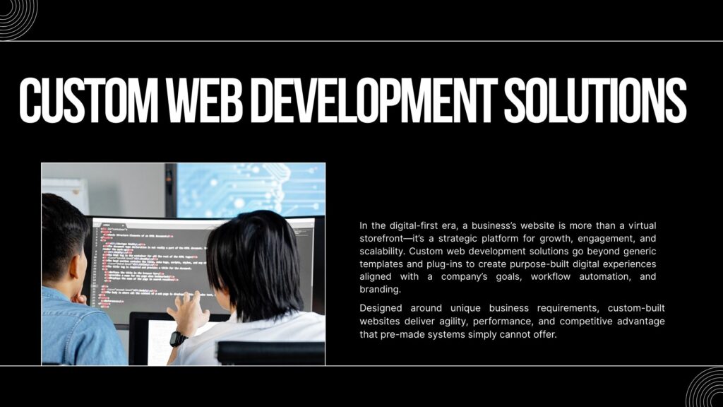 Custom web development refers to the process of designing and building a website or web application from the ground up using frameworks, coding languages, and tools that are tailored to the client’s objectives. Unlike “ready-made” CMS or page builders, custom-built web solutions give organizations complete control over architecture, functionality, security, and scalability. It’s not about reinventing the wheel—it’s about crafting a tailored experience that fits your business model as precisely as a custom suit. Whether building a high-performance e-commerce system, HRMS platform, booking management portal, or enterprise dashboard, every feature is intelligently designed for long-term sustainability and user experience excellence.
